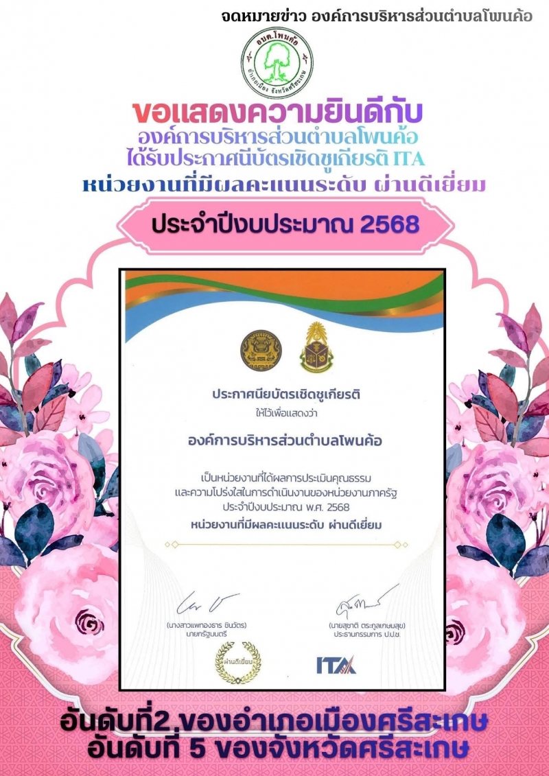 วันอังคาร ที่ 9 ธันวาคม 2568 องค์การบริหารส่วนตำบลโพนค้อ นำโดย นางพัฒนิดา ดีพูน ปลัดองค์การบริหารส่วนตำบลโพนค้อ ปฏิบัติหน้าที่นายกองค์การบริหารส่วนตำบลโพนค้อ หัวหน้าสำนักปลัด และพนักงานส่วนตำบลเข้าร่วมรับประกาศนียบัตรเชิดชูเกียรติให้แก่หน่วยงานที่ผ่านกาประเมินคุณธรรมและความโปร่งใสในการดำเนินงานของหน่วยงานภาครัฐ (ITA ) ซึ่ง องค์การบริหารส่วนตำบลโพนค้อ อยู่ในระดับ (ผ่านดีเยี่ยม) ประจำปีงบประมาณ 2568